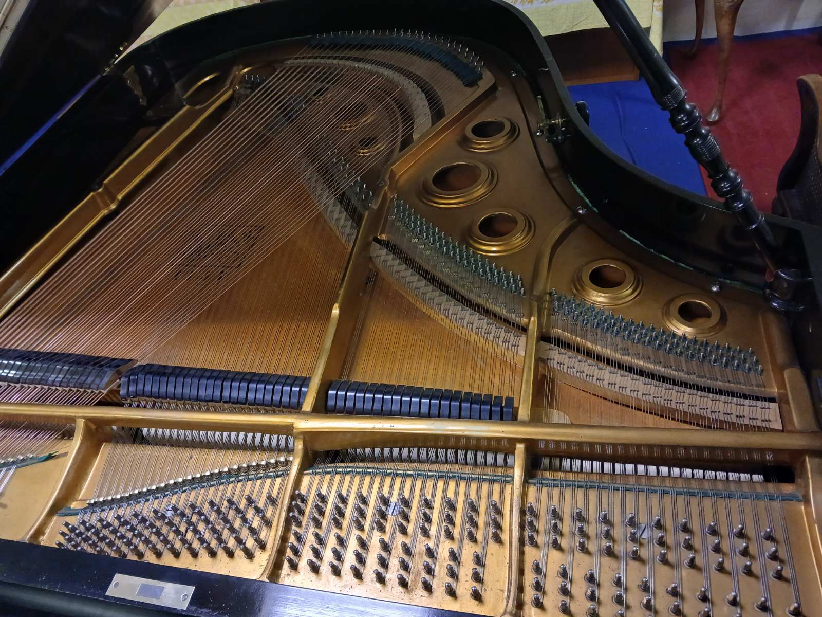 Prestigioso pianoforte costruito da Julius Bluthner, pluripremiato costruttore di pianoforte di Lipsia (Germania). Lo strumento, realizzato attorno al 1885, è caratterizzato da soluzioni tecniche interessanti e innovative. L'arpa è in ghisa monofusa, assai all'avanguardia per l'epoca. Le corde sono incrociate nei bassi; anche la sezione più bassa delle corde d'acciaio, che poggia su un ponticello dedicato, è incrociata nella stessa direzione dei bassi. Assolutamente innovativo l'introduzione del brevetto Aliquot, sistema che aggiunge una corda negli acuti (portandole a quattro) che suona unicamente per risonanza: questo permette, nelle intenzioni del costruttore, una maggiore profondità e modulabilità della timbrica. La parte meccanica è in condizioni buone. La meccanica è di tipo Bluthner-patent senza doppio scappamento. Nonostante ciò risulta molto agile e veloce nella ripetizione. Arpa, tavola e somiere sono in buone condizioni e rendono lo strumento pronto per essere suonato. La sonorità dello strumento è imponente. Bassi molto rotondi si accompagnano ad un registro centrale molto chiaro e definito. La parte degli acuti e dei cantini è brillante e profonda. |